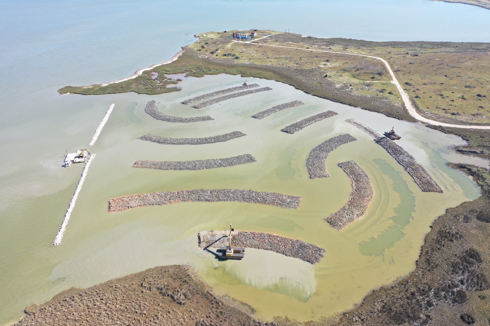 (Kemah, TX – February 11, 2021) – Construction is underway to add 73 acres of wetland restoration and shoreline protection in Dollar Bay – Moses Lake. The joint conservation effort between Galveston Bay Foundation and local, state, and federal partners will add 47 marsh grass terraces of intertidal marsh complex to protect and restore an area that has suffered from harmful erosion impacts. The new project is directly adjacent to Galveston Bay Foundation’s recently acquired 106-acre coastal prairie tract which will serve as a buffer for the wetlands.