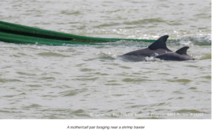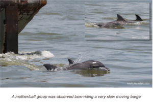 In June, GDRP researchers observed a group of dolphins that were initially behind a shrimp trawler. When the trawler pulled in its nets, the group moved to “bow-ride” a very small moving barge. There was barely any wake to ride, so it looked a bit silly! But, it seemed like that perfect opportunity for the small calves in the group to learn and practice their bow riding skills with their mothers. It was a short lesson though!
