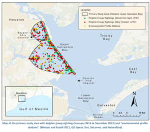 We are thrilled to announce that our study "Salinity and water temperature as predictors of bottlenose dolphin (Tursiops truncatus) encounter rates in upper Galveston Bay, Texas" was published in November in the journal Frontiers in Marine Science. Our main objectives in this study were to 1) evaluate if dolphins are found year-round in our primary study area in UGB and 2) investigate the effects of water temperature and salinity on dolphin presence in UGB. Dolphin presence was measured using "encounter rates" that are equivalent to the number of dolphins sighted (dolphins) per linear kilometer surveyed (km). Using multiple regression analyses, a statistical tool that identifies relationships between variables, we evaluated if and how water temperature and salinity predicted dolphin encounter rates.