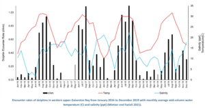The results of the study showed that dolphins are present in UGB year-round but many leave during the cooler months. Every year, dolphin encounter rates will increase in UGB after the water has warmed to about 23°C (73°F - typically in May) and will remain high throughout the summer. However, if there is a drop in salinity, usually due to heavy precipitation and flooding, many dolphins will leave UGB regardless of the time of year and water temperature. In conclusion, water temperature and salinity are both very important factors in determining dolphin presence in UGB, and low salinity will supersede temperature.